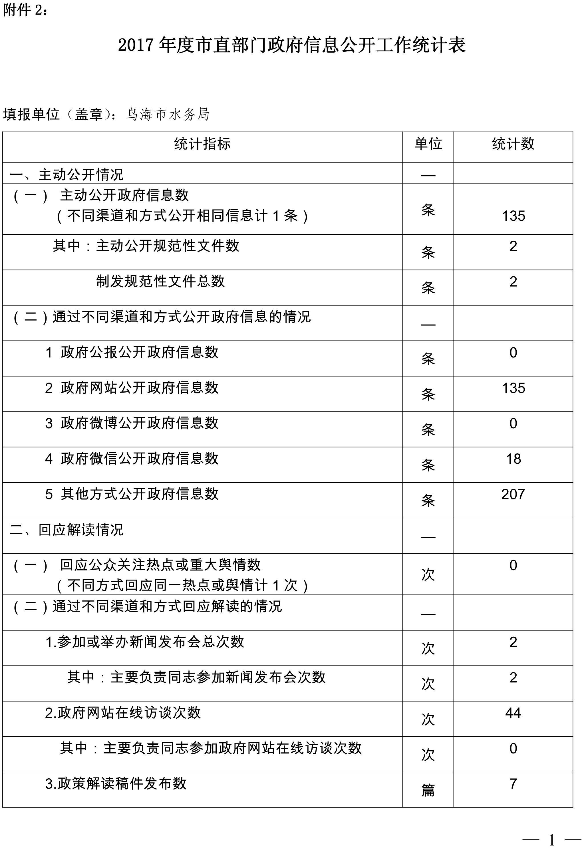 (二)主动公开政府信息。2017年,我局在市365bet400电话_365bet亚洲官方_www.28365-365.com网站公开发布各类信息135条(其中包括规范性文件2个,分别是《乌海市全面推行河长制工作方案》、《乌海市农业水价综合改革实施方案》)。通过微信公开政务信息18条。