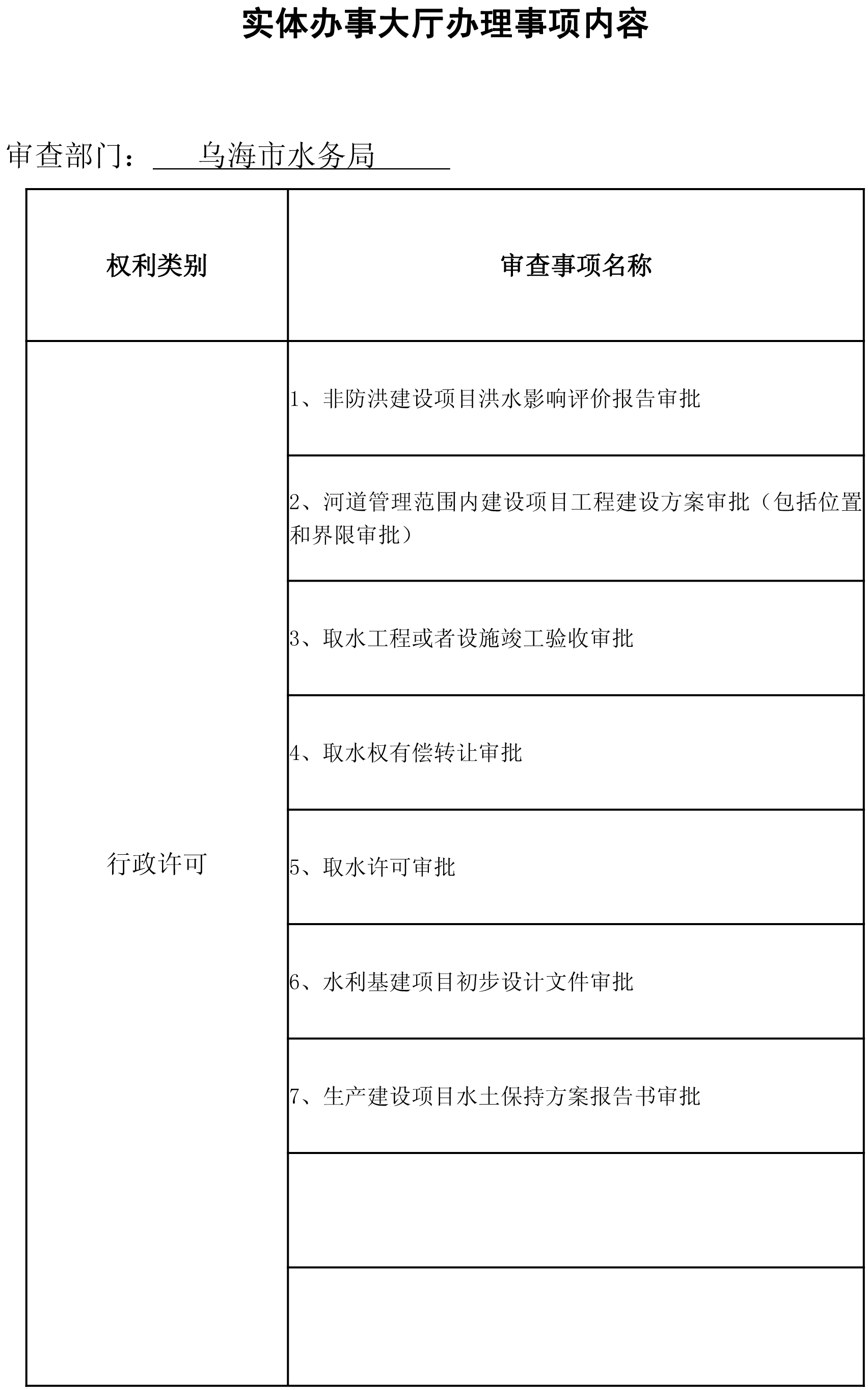 (一)政务服务制度。一是不断完善政务服务制度和流程,及时在网上更新取水权有偿转让审批流程图及服务指南、建设项目水资源论证报告书审查流程图等政务服务指南流程。二是规范权力、责任清单。2017年以来,组织开展了除行政许可外的行政权力清单梳理工作,形成了行政许可、行政处罚等145项行政权力清单,并通过市法制办审核,在市政府和365bet400电话_365bet亚洲官方_www.28365-365.com网站进行了公示。三是多方式推进审批事项公开,提升服务水平。为方便群众查询办理审批事项,印制了《乌海市365bet400电话_365bet亚洲官方_www.28365-365.com行政审批事项便民卡》,置于窗口醒目位置以便查询。