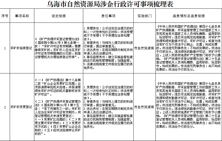 乌海市自然资源局涉企行政许可事项梳理表